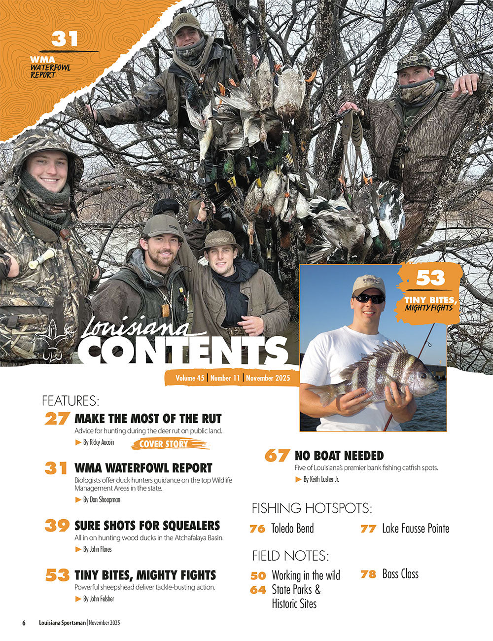This issue includes our annual WMA waterfowl report, a spotlight on Atchafalaya Basin wood ducks and a feature on hunting the deer rut. For the fishermen, we have a look at five productive bank fishing spots for catfish and strategies to use to catch more sheepshead.